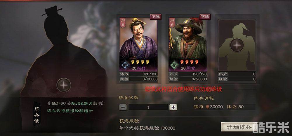 我们的君王殿升到7级即可开启演武场进行练兵,需要消耗一定的铜币以及30点体力。在后期我们可以通过练兵来快速提升新武将的等级,而且随着演武场的等级提高,我们可以自然也可以获得更多的经验。推荐大家练兵时最好每次就上阵1个武将,节省体力的同时能够实现利益最大化。