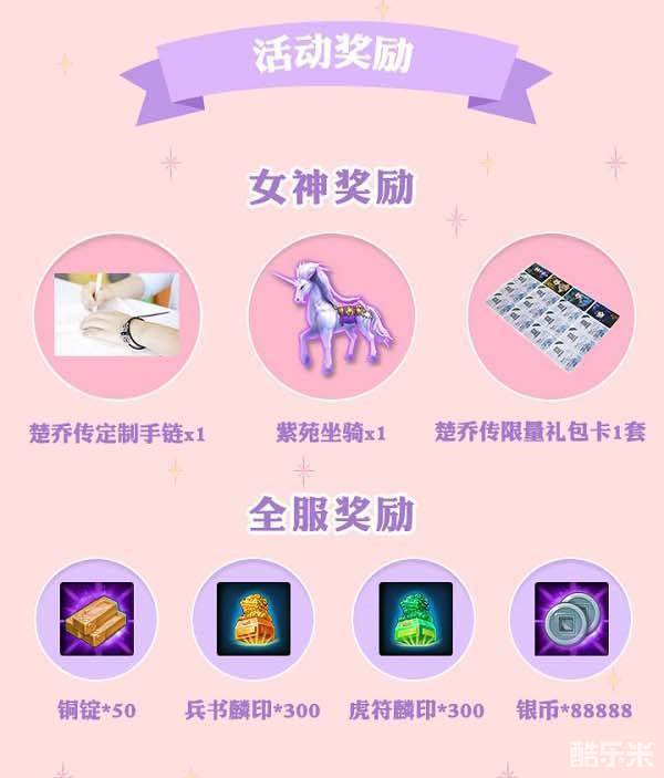 女神奖励:楚乔传定制手链x1,紫苑坐骑x1,楚乔传限量礼包卡1套.