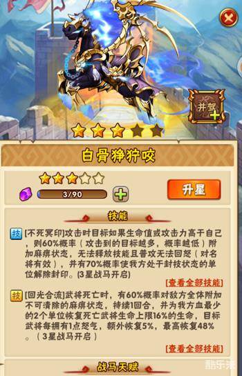 新金马“白骨狰狞咬”的技能,可极大概率麻痹攻击力或血量高于自身的武将,限制其技能和回怒,还可清除己方武将的封印状态。此外,佩戴该金马的武将在死亡时,金马将释放大招,可大概率将敌军全体造成麻痹,并回复己方低血量武将的血量和怒气。