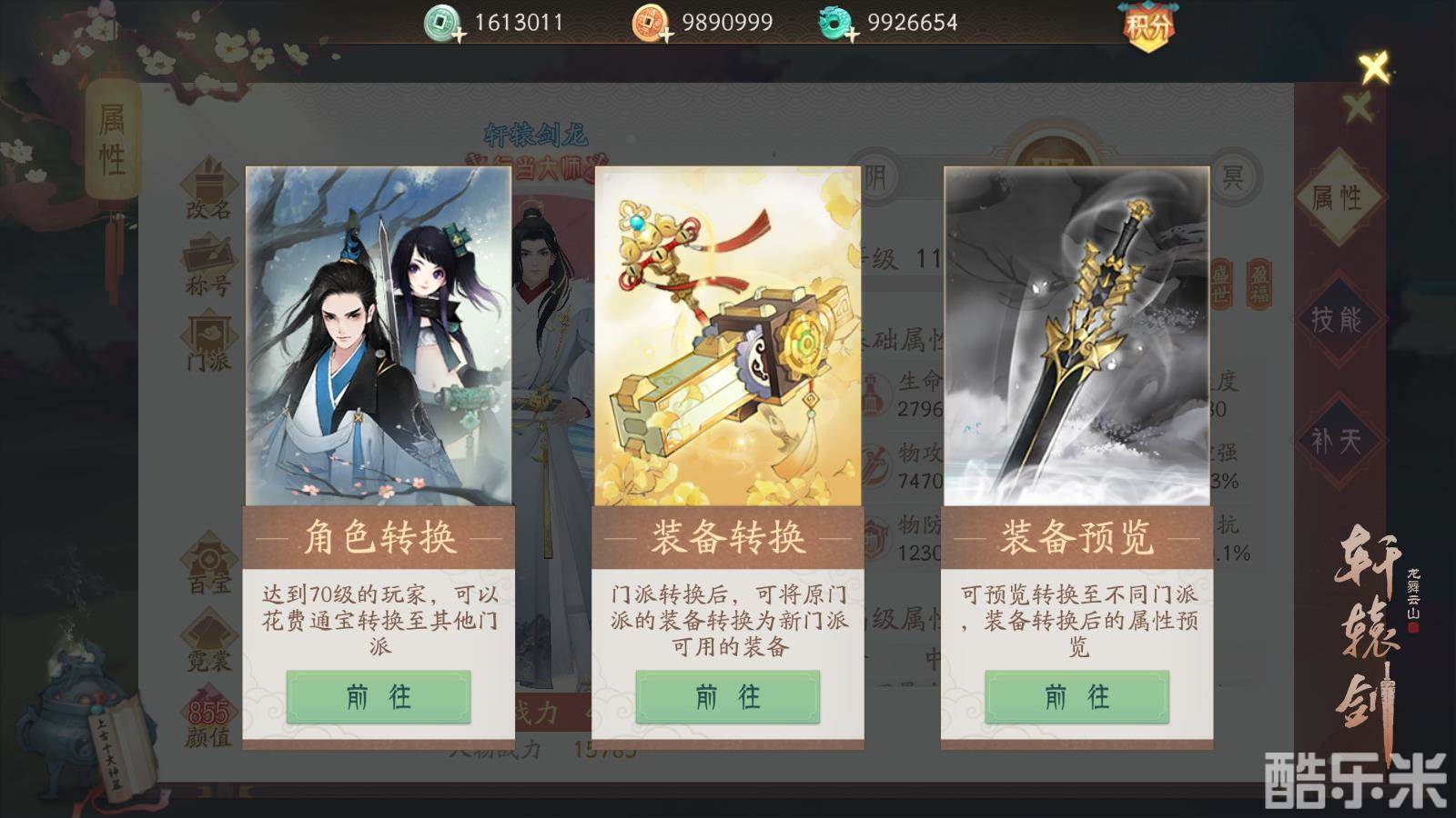 少侠还可以通过装备转换功能,把旧门派的装备转为新门派装备。装备除了特技不变,基础属性、炼化属性也会随着门派的转换而有所变化。精心打造的装备,其属性会变为新门派的对应属性,继续陪伴侠士们游历诗情画意的盛唐风华。