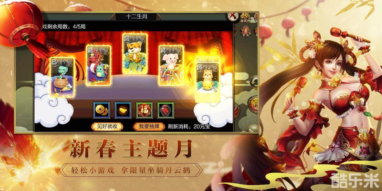 为了减轻玩家负担,主题月活动将延迟至2月与大家上线见面,可以不用在春节期间忙着计算积分了。本次主题月活动,设立了十二生肖和比翼齐飞两个小游戏,完成游戏可获得代币,并兑换江湖大侠礼包,永久沐澄云暖时装,春节永久新坐骑吉光片羽等超丰厚奖励!今天详细给各位说明一下生肖牌的玩法,首先玩家等级需要≥60级,每日每个人只能完成五局游戏,每天有三次免费抽牌的机会,第四次抽卡消耗10绑元,后续每次抽卡需比前一次多消耗10绑元,最后根据成功翻牌的数量解锁奖励,若玩家已经满足自己解锁的奖励,则点击【见好就收】视作本次游戏结束,即可领取成功翻牌数量所对应的奖励。