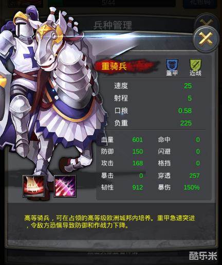 3.冲锋风险较大,作为一线骑兵单位,在容易被集火的情况下,因其格挡与闪避低下,若短时间无法达到需要效果,极容易被击溃。