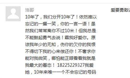 相比起上个故事的甜蜜,这位微信名为“浩哥”的朋友则是爱得令人惋惜。10年的时间对于都市人来说好长好长。长到曾经年少无知伤害过的人,都可能早已忘了那次伤害,而被伤害的最深的,是你自己。是坚持还是继续,浩哥你或者可以重新思考下再作选择,无论如何,你对爱情的坚持,足以令你自豪。