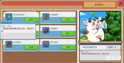 周六周日各开放一次钓鱼活动,活动期间,球球会带着活动商店出现在小镇中心的广场上,商店内可以购买幸运药水,效果是游戏内2小时钓鱼直接上钩,不需要操作,30钻一个限购10个。
