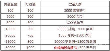【活动内容】活动期间可通过充值金币获得好运值,积累好运值即可打开宝箱奖励,闪耀称号,全新神器,绝对超值的提升战力资源,尽在特惠好礼。