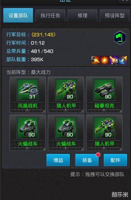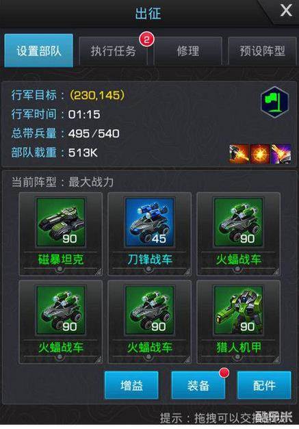 攻打被占领的资源矿或其他玩家基地时,如果对方实力明显弱的可以把战机放在一号位。如果对方是单体输出超高的战车放在一号位,战机易被秒杀,可考虑将机甲或者坦克放前排,作为肉盾吸收第一波伤害。