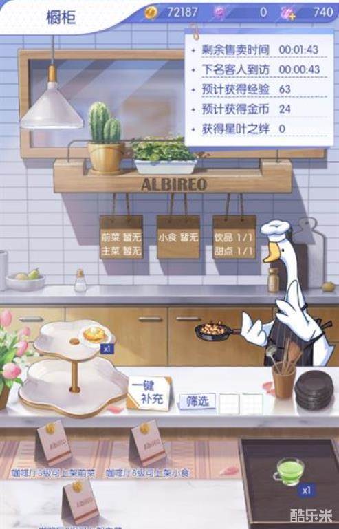 点击橱柜的不同位置可以售卖不同类型的菜品饮料,一定时间后,可以通过收银按钮,收取金币、咖啡厅经验。