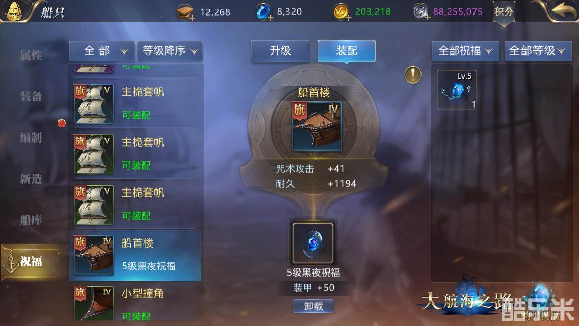 值得一提的是,只有4级及以上的船只装备才能配备祝福(每件船只装备只能装备1个祝福)。与船装等级一样,祝福也有品级之分,船长可以用2个同种低等级祝福合成更高等级的祝福。