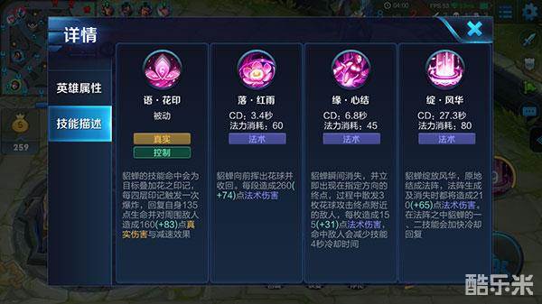 被动-语·花印:貂蝉的核心技能,每次技能命中敌人都可以叠加一层印记,当印记到达四层之后就会触发被动,回复自身生命值并对周围敌人造成真实伤害和减速效果,这让貂蝉在线上有着很强的消耗能力,前期也不需要出太多的法术装备就能打出很高的伤害。