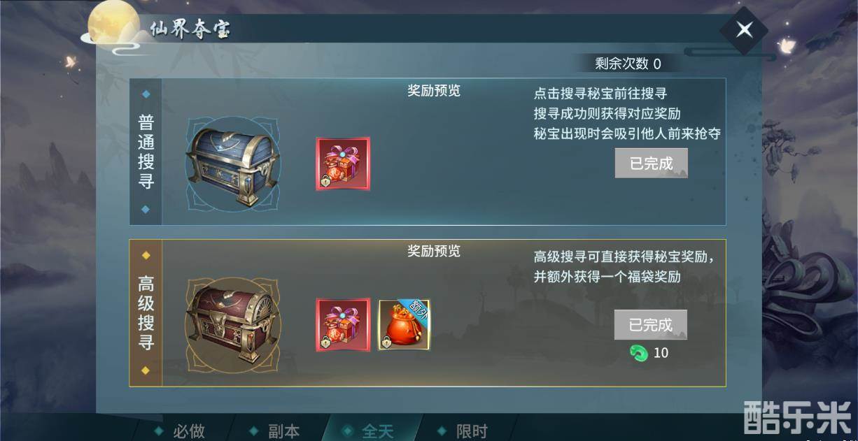 挑战事项:每日3次探宝搜索,开启后会被随机传送到戮墨地城某个位置;位置信息将会在系统信息公示,打开宝箱需要一定时间;在此期间随时可能招来他人抢夺,所以在这个修仙世界里你要努力变强哦。