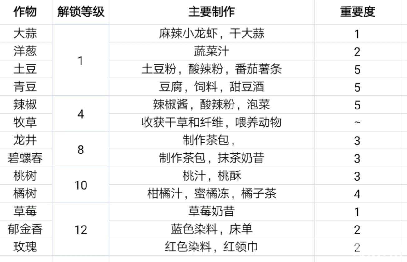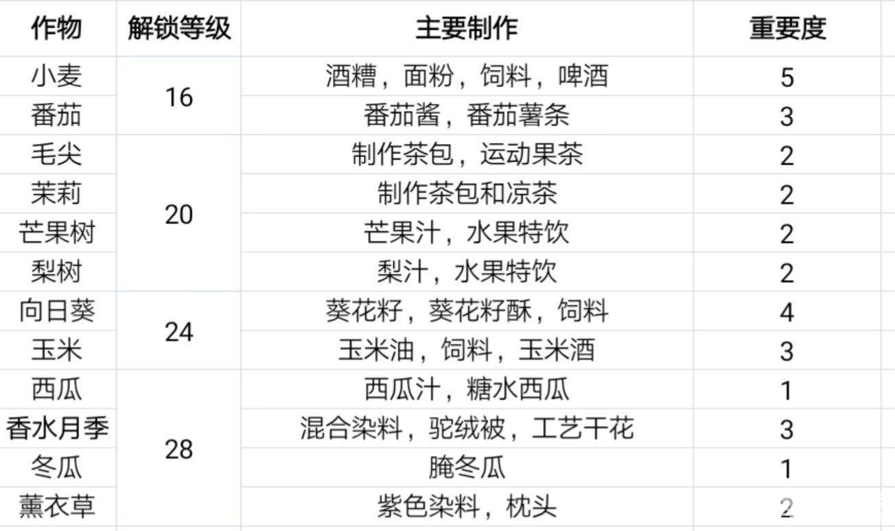 最后说一次,我给的重要度是按照我和几个大佬的需求给的,可能有些后期,萌新尽量按照自己当前需求种植作物,想囤多一些农作物可以参考一下上图的数据。