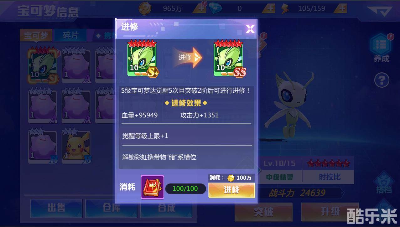 玩家的S以及S级以上宝可梦培养进度达到5觉2突后可以进修,进修需消耗进修手册,进修后的宝可梦可获得大幅属性加成,同时可以进行6觉以及装备彩虹携带物。