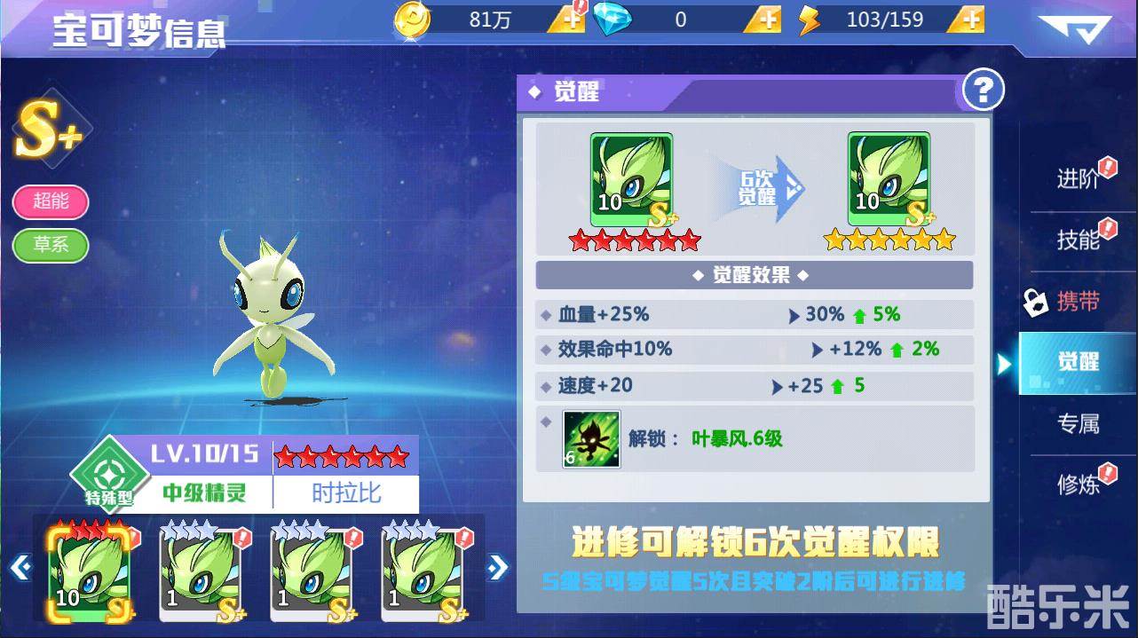 宝可梦进修后可开启第六次觉醒,入口与普通突破相同。宝可梦第六次觉醒可获得大量属性加成。