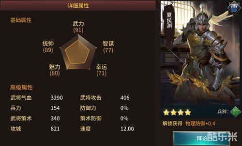 首先是夏侯渊,,夏侯渊拥有初始武将中最好的基础属性,统帅和武力都不亚于大部分五星武将,其他属性也是在四星武将的平均值之上的。除了基础属性外,夏侯渊的前两个技能都是主动技能,在前期直接就有非常可观的技能爆发完全不输五星武将,推荐指数:★★★★★。