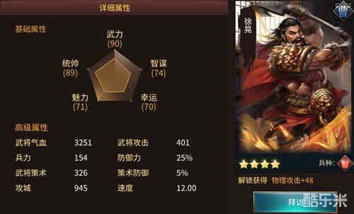 肉盾徐晃作为初始武将中的唯一前排,还是盾步兵,也有着很高的武力值和统帅值。徐晃的前两个技能分别为输出技和范围回血,配合貂蝉再加个前排,就算是配合骑兵都可以创造出非常不错的输出空间。推荐指数:★★★★☆