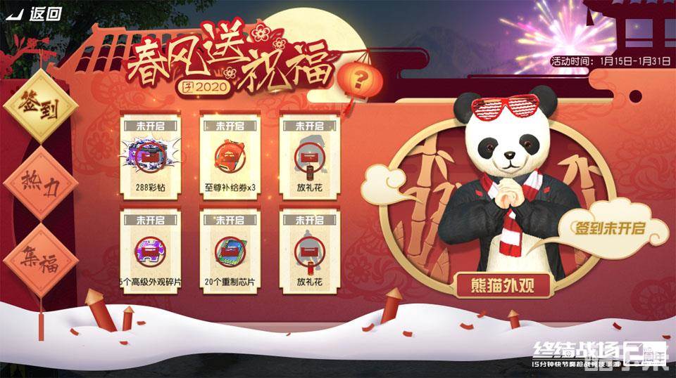 本周更新后,《终结战场》春节活动正式开启,最先登场的是“签到赢好礼”,玩家每日登录即有机会收获海量奖励,还有人见人爱的节日限定国宝外观套装助力狂欢。1月15日签到活动开启预览,玩家可提前了解活动详情,1月18日至1月31日之间,玩家可凭累计签到天数领取对应奖励,需要注意的是每种奖励物品只能领取一次。