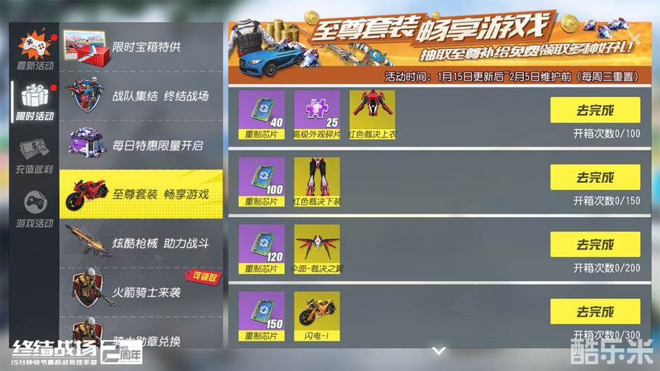 在本周的至尊补给活动中,玩家只需抽取载具补给达到一定次数,即可获得摩托车载具外观“闪电-I”、降落伞外观裁决之翼以及人物外观红色裁决套装,抽取领取双管齐下,加速收集全新外观。