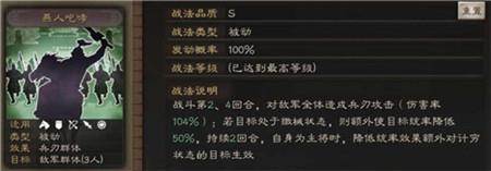 【被动战法】燕人咆哮:战斗第2、4回合对全体造成兵刃伤害,若目标处于缴械状态则额外使目标统率降低持续2回合。身为主将时,降低统率效果也会对计穷状态的目标生效。