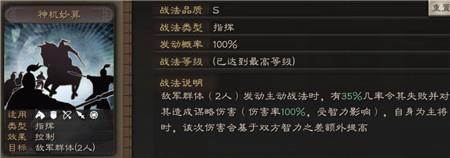 【指挥战法】神机妙算:敌军2人发动主动战法时,有几率失败并对其造成谋略伤害。自身为主将时,伤害会基于智力属性差额外提高。