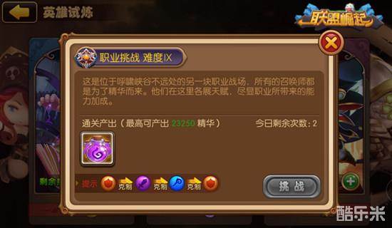 英雄试炼系统共有三种挑战模式——技能挑战,职业挑战,不死诅咒。每种挑战解分为九个难度,通关当前难度且等级达到要求即可开启下一个难度的挑战。难度越高,奖励越丰厚!