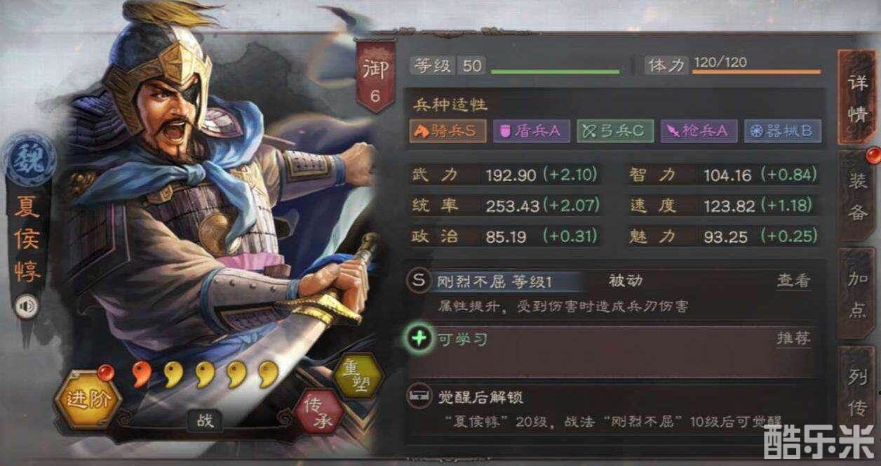 2.1的武力算是不错了,二线物理输出水平,2.07的统率成长相当可以,保障自身坦度。0.84的智力属于普通偏低,谋略承伤的能力还可以。1.18的速度有抢先手的潜力。三国志算是不怎么黑夏侯惇的一个游戏,这三围成长我是相当满意了。