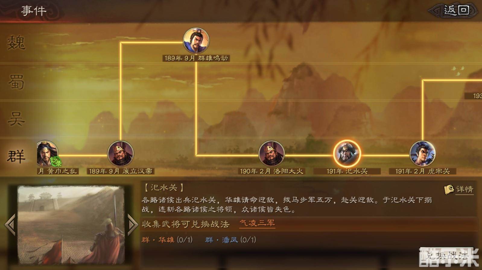 如下图的汜水关事件,收集武将群·华雄、群·潘凤即可兑换事件战法“气凌三军”。