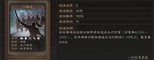 发动普通攻击前会对敌军单体造成兵刃伤害(伤害率62.5%-125%),自身拥有功能性增益状态时提高9-18点物理,最多可以叠加5次。