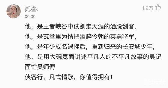 无巧不成书,《侠客行》不止是王者今年的第一支英雄主打歌,亦是吴亦凡2020年的第一首单曲。吴亦凡在2019年发布了数首国风单曲,其中《大碗宽面》更是一度掀起全网热潮,圈了不少路人粉!此次全新单曲《侠客行》同样以浓郁的中国风元素、电子元素结合的风格走进玩家、粉丝视野,词曲共映,荡气回肠,深度刻画了英雄李白的悠悠求道之路上破敌傲世、洒脱不羁的侠客形象。