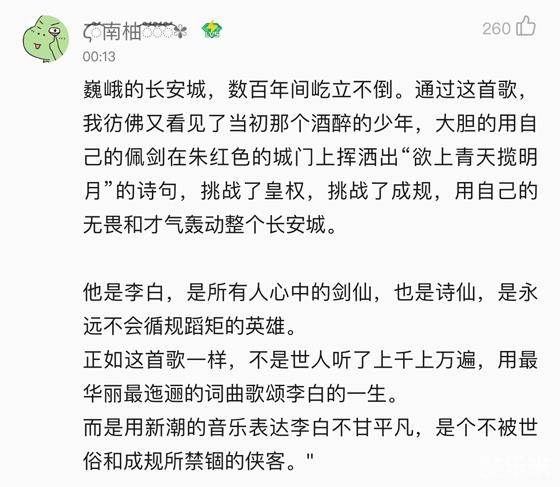 我从不折服 绝不让步”又仿佛将英雄李白那股洒脱侠义之气糅入词曲之间,传递着“不惧艰难,披荆斩棘”的力量。
