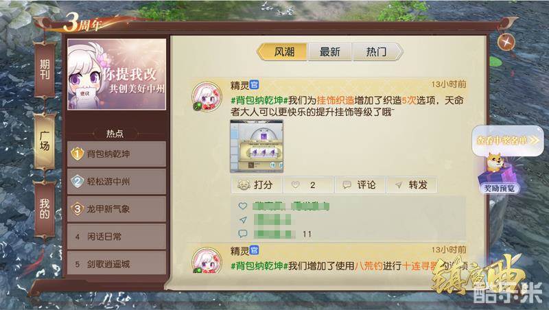 专属页面长期开放,每位天命者都可以畅所欲言,还有期刊记录采纳意见、建议,一起见证中州变得越来越好!被选中的天命者,将收到开发组送上的丰厚奖励,认真参与也有机会被好运砸中、收获各类珍稀道具!