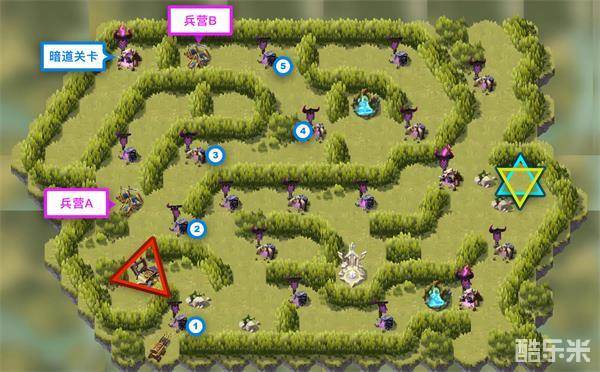 2、入口处左侧的“红三角关卡”,通关后可以打开“兵营B”左侧的草丛进入“暗道关卡”