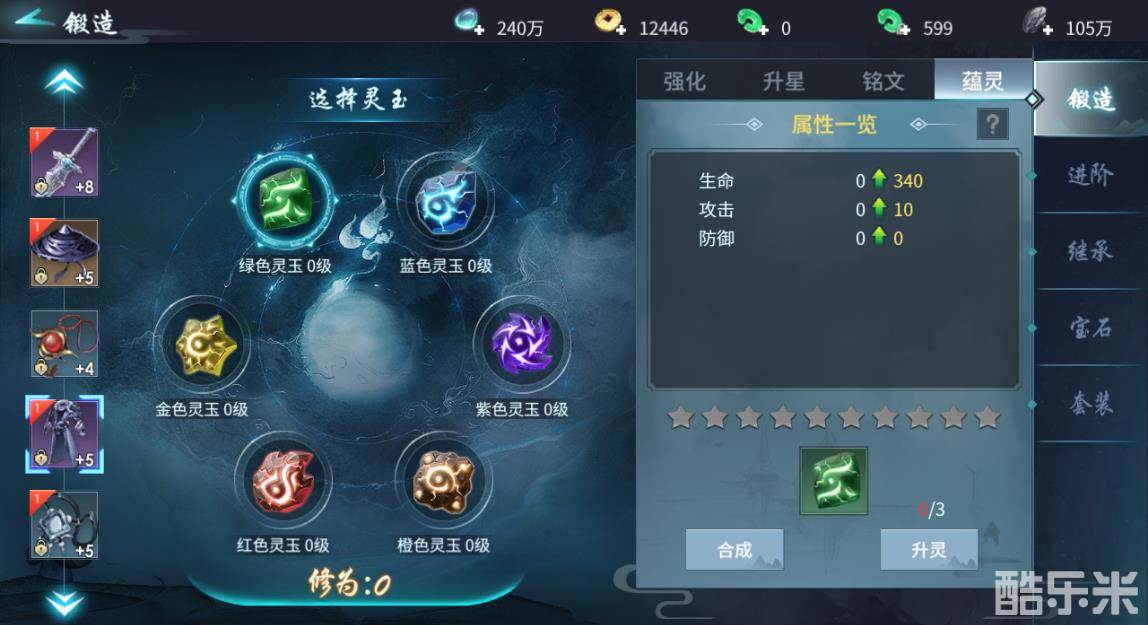已穿戴装备的部位可以进行装备蕴灵,提升相应的属性,每个部位的装备可以蕴养6种不同品质的灵玉,各灵玉最高可提升至10级;灵玉材料主要通过灵玉副本获得,高品质灵玉可通过低品质的灵玉合成。
