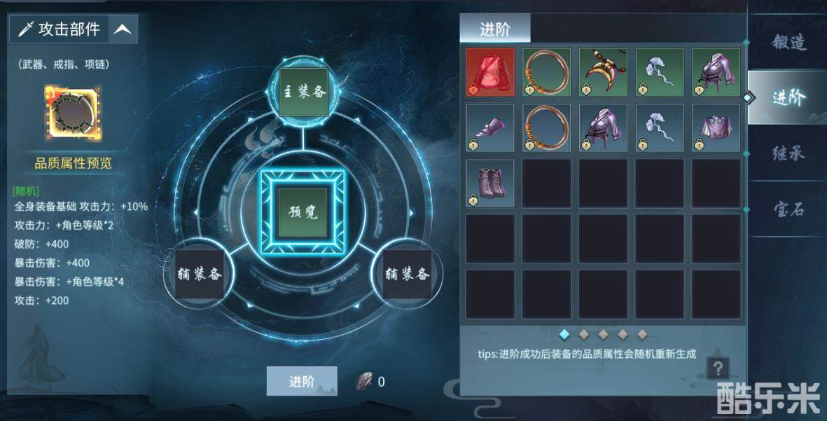 进阶必须放入最少3 件品质、职业、部位、等级相同的装备,进阶成功后会获得件同品质、职业、部位的更高一级装备,装备会保留三件装备的中最高强化等级以及主装备的幸运属性,但品质属性会随机生成1~6条;品质越高的装备,进阶后出现多条品质属性的几率越高,进阶过程中如果有装备进行了套装打造,会返还消耗的套装石。