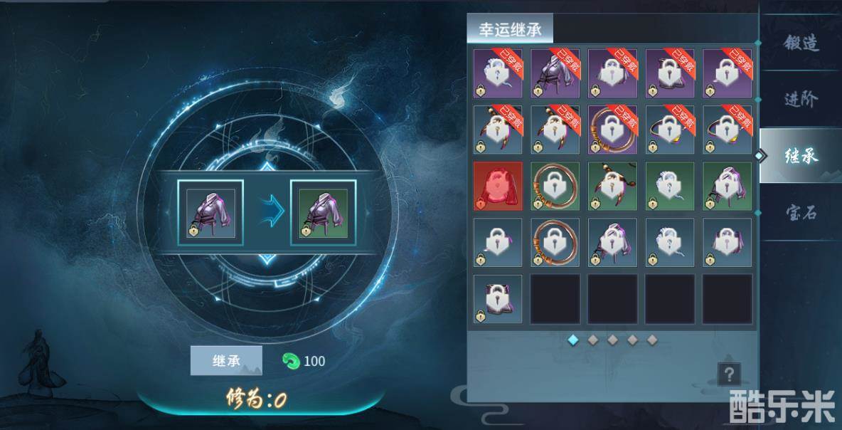 继承需要消耗仙玉,幸运继承将把源装备的幸运属性,替换掉目标装备的幸运属性,不能继承源装备的品质属性,只能继承同职业同部位的装备。