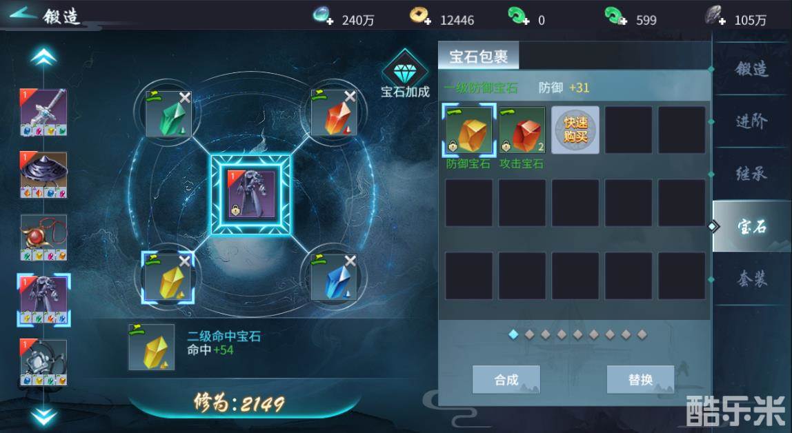 可对身上的各部位装备进行宝石镶嵌,获得属性加成,每个装备只能镶嵌4颗宝石,且宝石不能同类,可对宝石进行替换或升级。