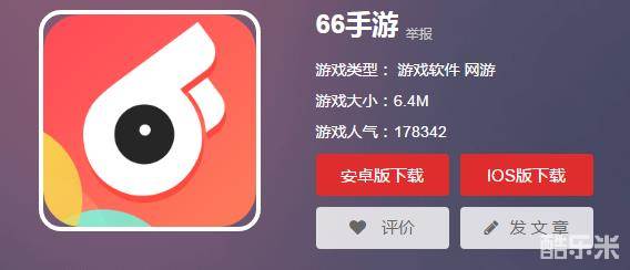 点击进入酷乐米门户网站,搜索66手游,进入之后你会看到有两个下载按钮,分别是【安卓版下载】和【IOS下载】,如图所示: