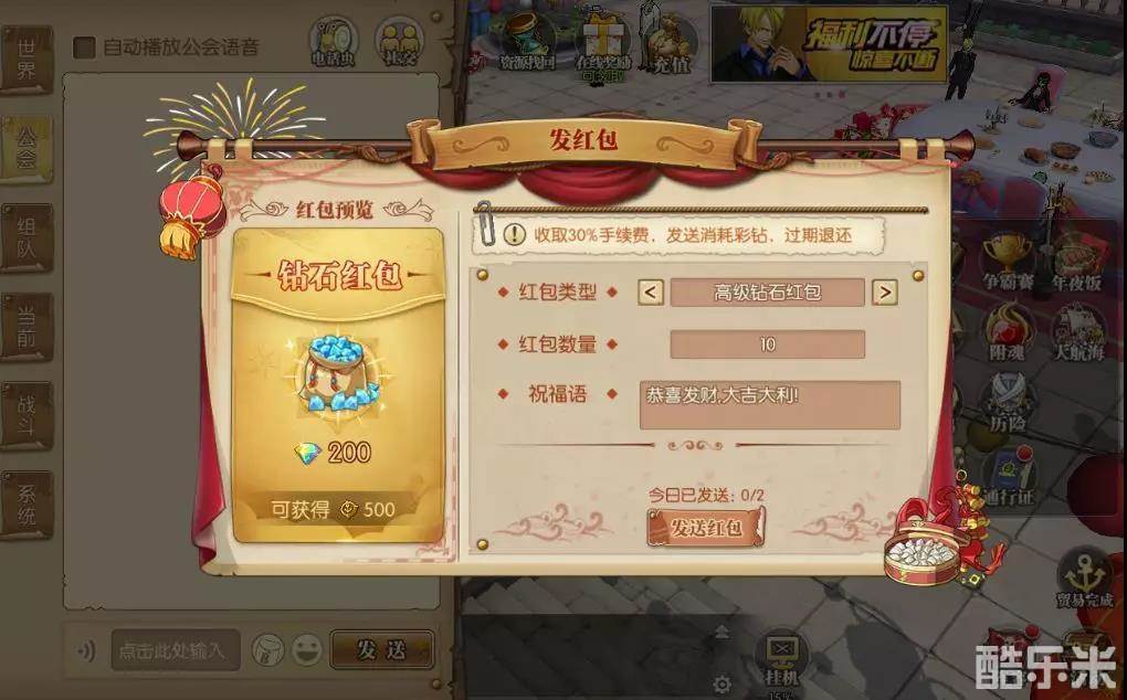 更新完成后,当船长大大加入公会即可在公会聊天界面中开启红包功能。红包有不同的种类,分别消耗金块和钻石可送出不同红包。送出红包后,即可收获对应红包的公会贡献值,公会技能还没点满的会长们,这可是个不可多得的好机会啊!!