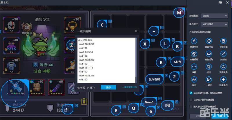 原理篇:在一键宏中编写以下代码。第一句是反馈模拟器的分辨率。后面touch接坐标就是指在这个坐标位置点击一次。wait后面是接是时间。所以完整的过程是六步。打开背包>点开元素戒指>卸下>点开元素戒指>装上>关闭背包。每一步等待时间是0.1秒,所以完成一次需要0.6秒。