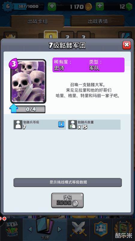 骷髅军团:它虽然生命力低,但是只需要3圣水就可以解锁,是皮卡、巨人和一部分陆地上大型卡组的克星,可以在关键时刻抵挡对面的进攻,是前期必备卡牌之一。