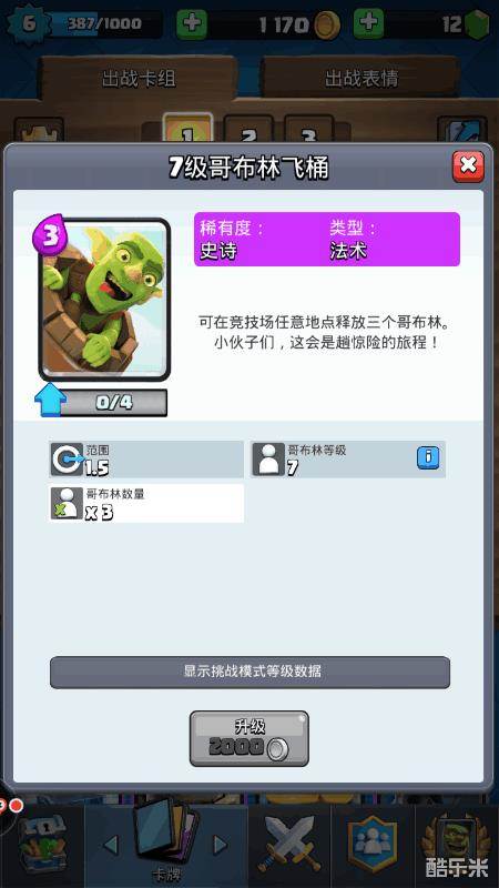 哥布林飞桶:3圣水解锁,可以在地图上面任何地点释放,我一般都是直接拿来攻击对面公主塔,移动速度快,对塔伤害高,是我拿来拆塔的主力军。