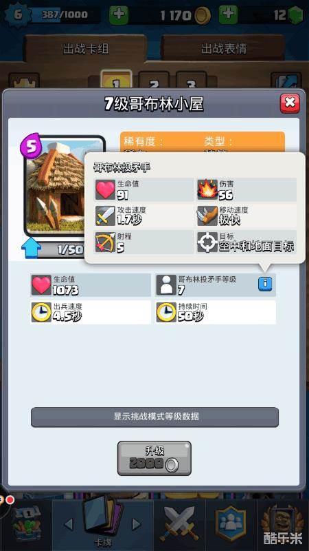 哥布林小屋:5滴圣水解锁,我的小屋目前是7级,平均4.5出一个小兵,一个小屋可以持续50秒,源源不断可以出11个哥布林,用来给对面造成骚扰感觉很不错,并且可以攻击空中和地面目标。我目前是配合骷髅墓碑使用。