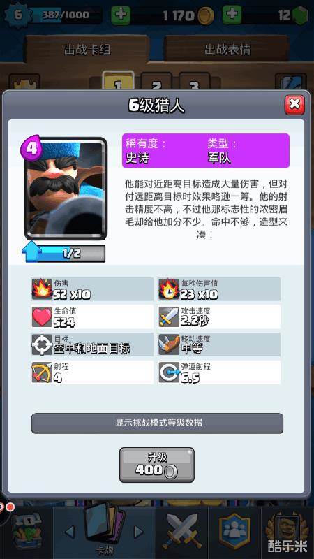 猎人:4滴圣水解锁,对近距离的目标伤害极高,我是用来防御对面的进攻,和对付空中目标。不适用与大范围卡组的攻击。这张卡可以替换成骑士/巨人/或者女武神。
