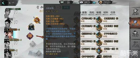 焰形刀,单挑神器,和人单挑切磋时先使用日月宝典触发焰形刀被动,第二个回合配合刀光寒影和焰形刀使用千叶机变刀,千叶机变刀应该是刀法多段次数最多的,正常来说没有其他的加成是九段的刀法攻击,每刀附带50流血结束为450流血,这个版本在80流血以上会触发血流不止效果,血流不止这个效果是不在状态显示的,触发的效果就是80流血以上每次攻击会触发基础伤害的同时额外消耗对方10W生命,在触发血流不止之后所有攻击的每一段攻击都会触发这个效果,触发血流不止之后如果不想用刀法可以用九剑去补伤害,毕竟九剑是攻击段数是最多的武学。
