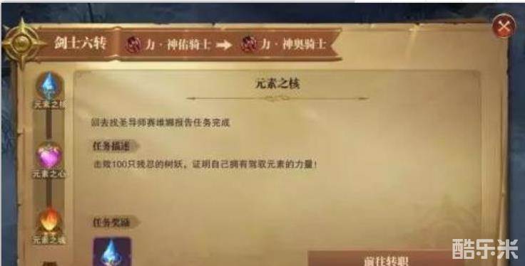 等级达到大师190级时可以接取六转转职任务,六转任务流程中,圣导师赛维娜会授予您元素之力,让您变成更强的职业,但是需要您分别收集元素之核、元素之心和元素之魂三个材料作为激活元素之力的条件。