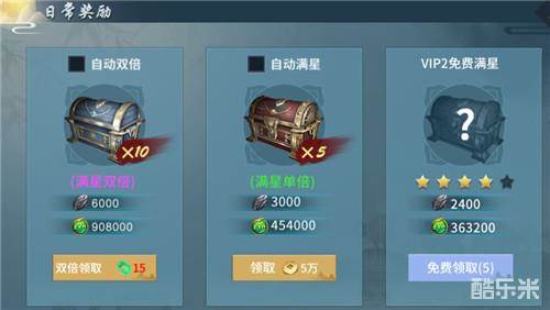 每天可以完成10个日常任务,对经验增长十分有效,每次完成任务后可以花费金币或仙玉选择高倍的任务奖励,也可以免费领取非满星奖励,平民也能获得极佳的游戏体验。