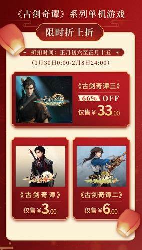 《古剑奇谭》系列单机,从1月30日至2月8日迎来史上最低价,限时折上折——《古剑奇谭》仅售3元,黑衣少侠邀您踏上冒险旅程;《古剑奇谭二》仅售6元体验蓝衫少年与偃甲的奇妙历程;《古剑奇谭三》降价66%,仅售33元,愿我人族,星火世传,奋飞不辍。