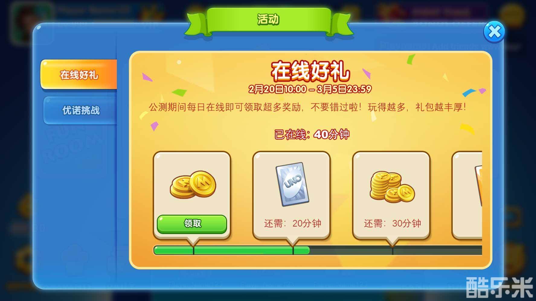 2月20日-3月3日(其中3月1日-3月3日为领奖时间),欢乐场、经典场或排位赛将随机掉落“黄金UNO牌”,参与牌局便可收集!收集到指定数量的黄金牌,即可领取包含金币、刮刮卡、护盾在内的丰富礼包!更有绝版勋章等你来领!收集越多,奖励越丰厚!
