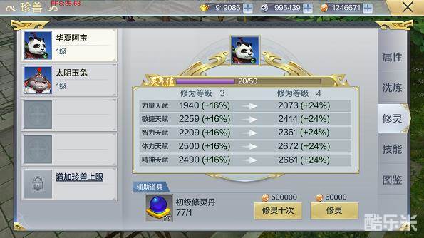 点击修灵标签页可以进入珍兽修灵界面