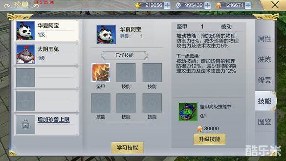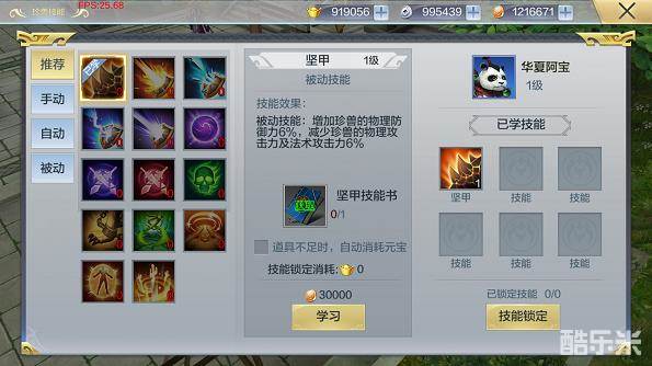 玩家可以通过珍兽技能书学习各种各样的技能,在界面左侧可以选择想要学习的技能.