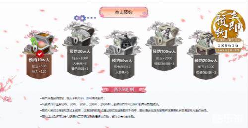 在新版《三生三世十里桃花》手游预注册已经限时开启,只要注册账号参与预约,皆可获得足量好礼。而预注册总数达到各个阶段的“小目标”时,每一位仙友的预注册礼包中都将增添更多惊喜哦!活动期间,所有预约的玩家总人数达到10W、30W、50W、100W时,全体玩家皆可以获得稀有道具奖励,成为四海八荒第一战神指日可待。